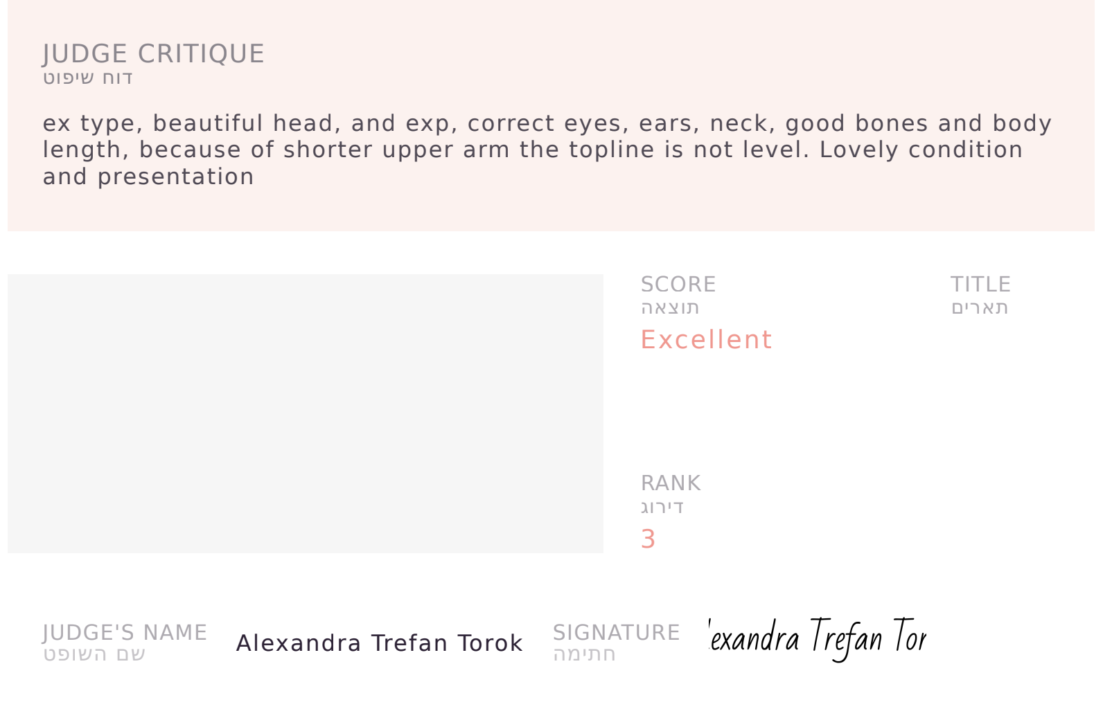 Я уже сама знаю все её недостатки и прям готова была, что эксперт даст ей страшный "Оч.хор" и выведет с ринга, но нет - судья дала Ех и третью позицию среди 5 собак в классе.