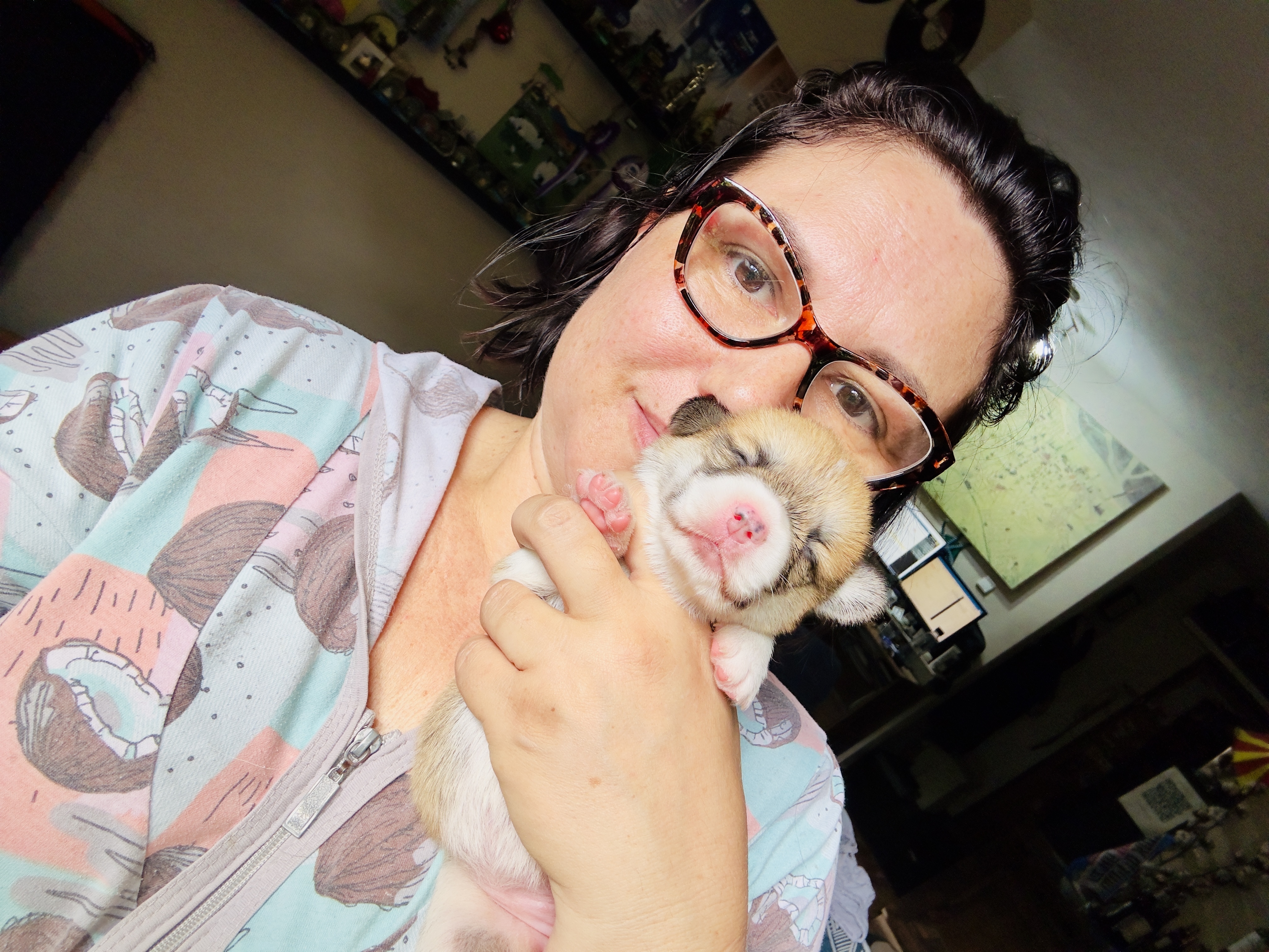 Наверное, собачий бог дал нам этого щеночка как компенсацию за прошлый тяжёлый помёт - ибо такого спокойного младенчика я ещё не растила (ттт). Она пищит всего раз в день к вечеру - может, у неё животик болит, а может, возмущает тот факт, что мы выключаем мазган; потому что если включить его снова - Уна успокаивается и засыпает.