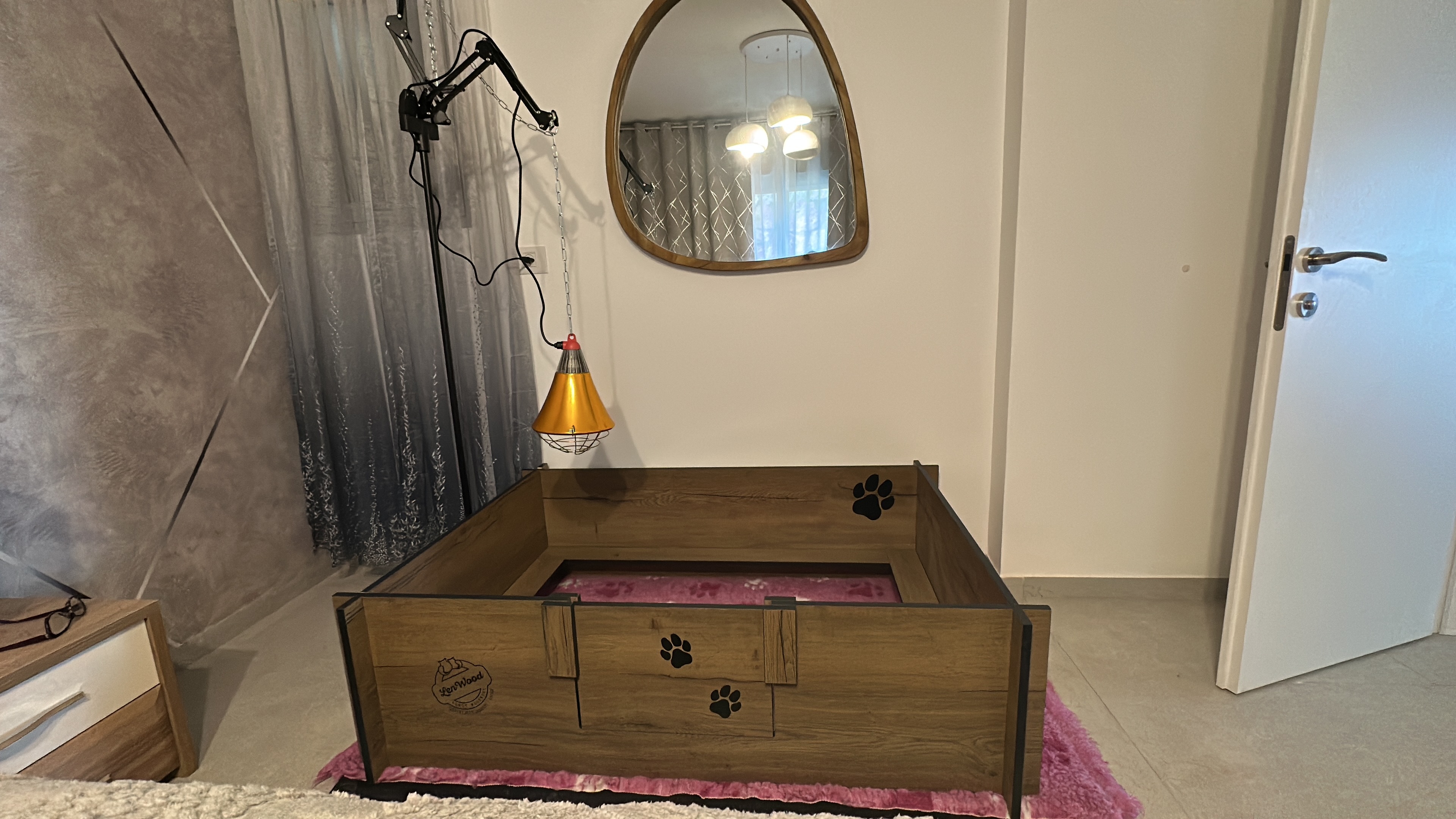 В пятницу приготовили родильное - а потом и щенячье - место. Теперь оно будет у нас в спальне, так что будет проще быть рядом с щенками и ночью тоже. Когда настанет им время переезжать из ящика в "загончик" за заборчиком - переселим их из спальни в нижний салон, откуда щенки смогут выходить во двор.